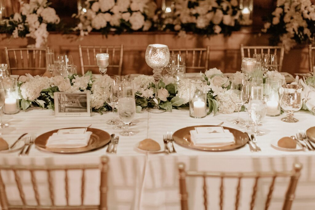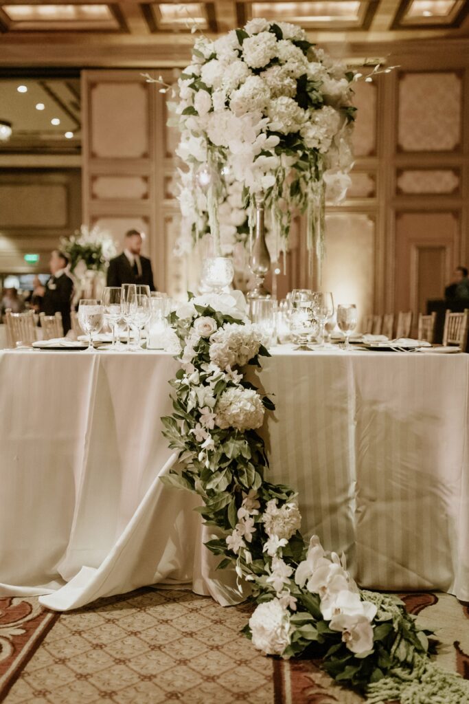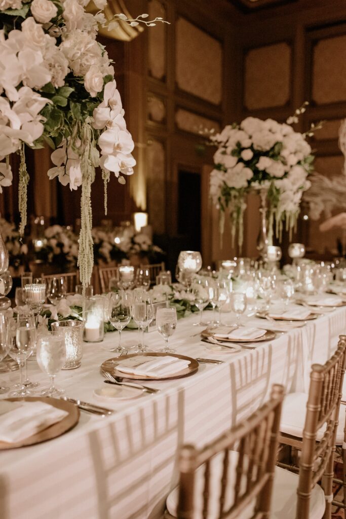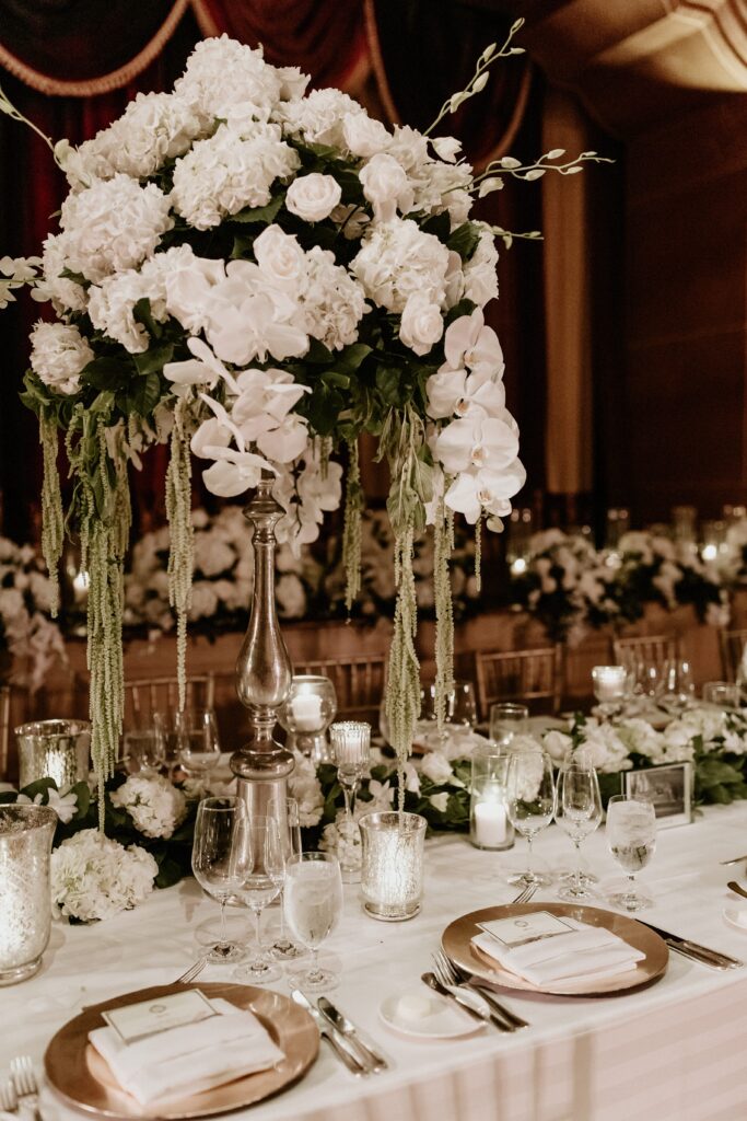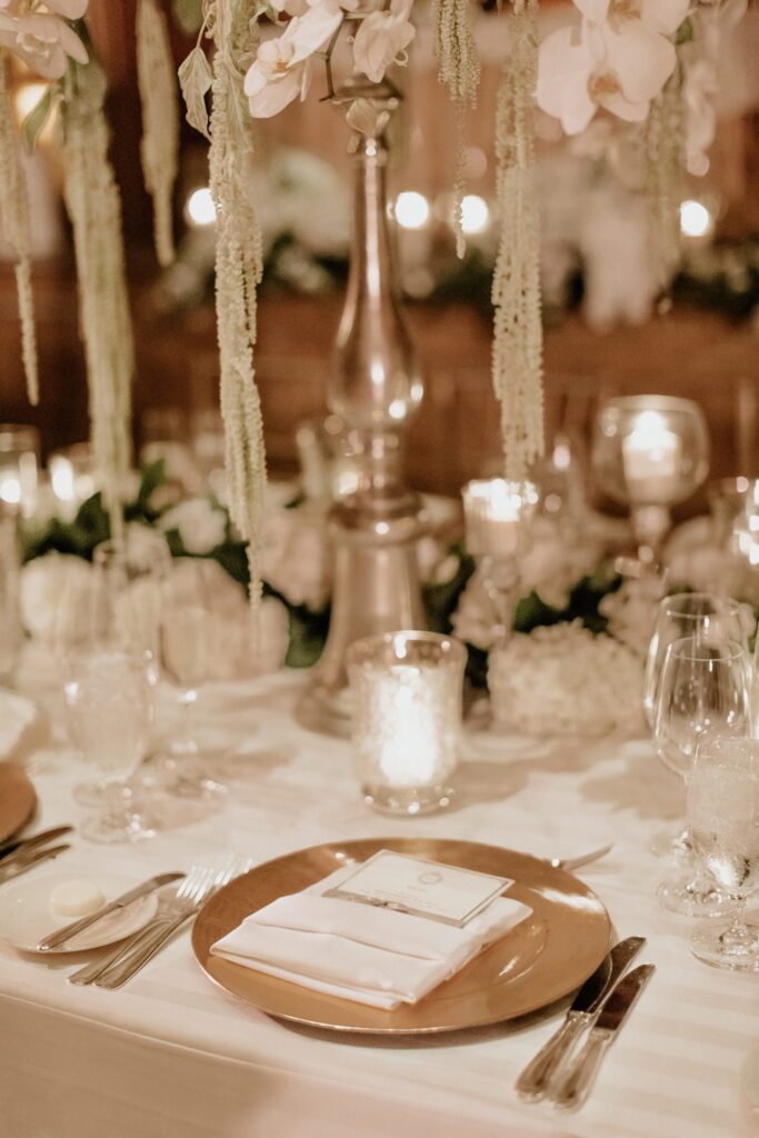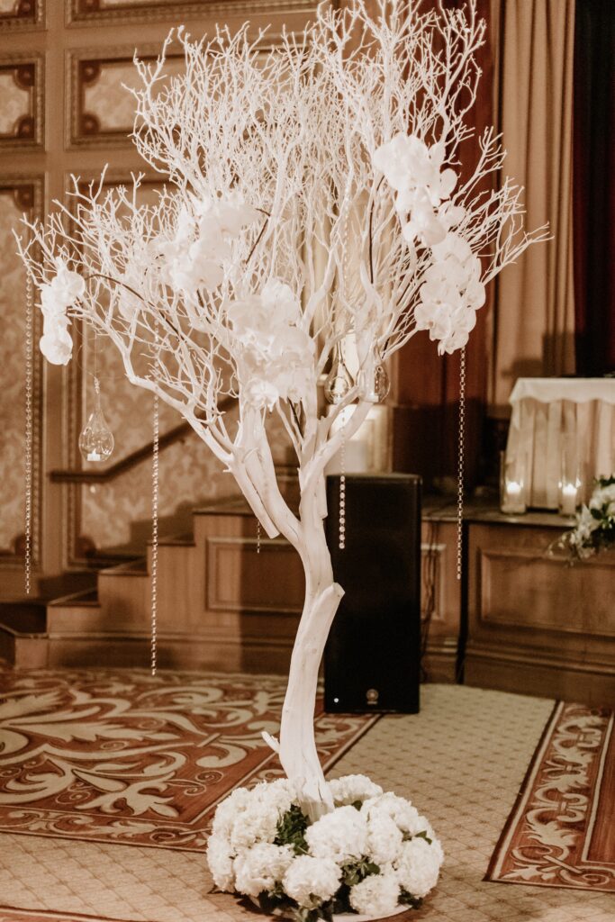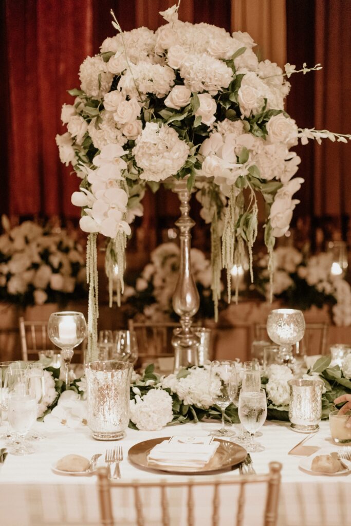 Our floral design for the reception was pretty spectacular. We did all white flowers in tall pewter vases and mixed those with greenery arrangements, so it felt more classic and romantic than overly glam. The best element though, was randomly placed 8-foot white manzanita trees with hanging orchids and hanging tea lights throughout the room. And the excessive candlelight on all the tables was very important to me. I asked our floral designer to use as many candles as the fire department would allow, and then add a few more, and she delivered!