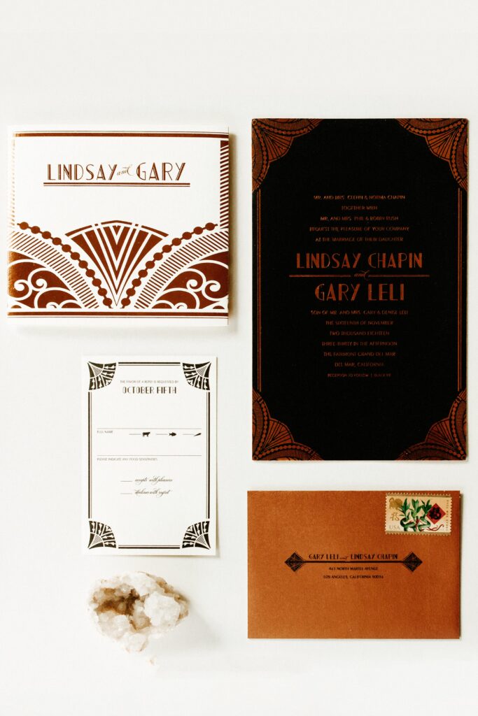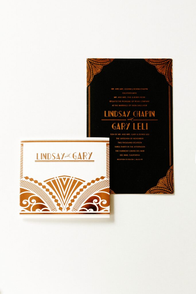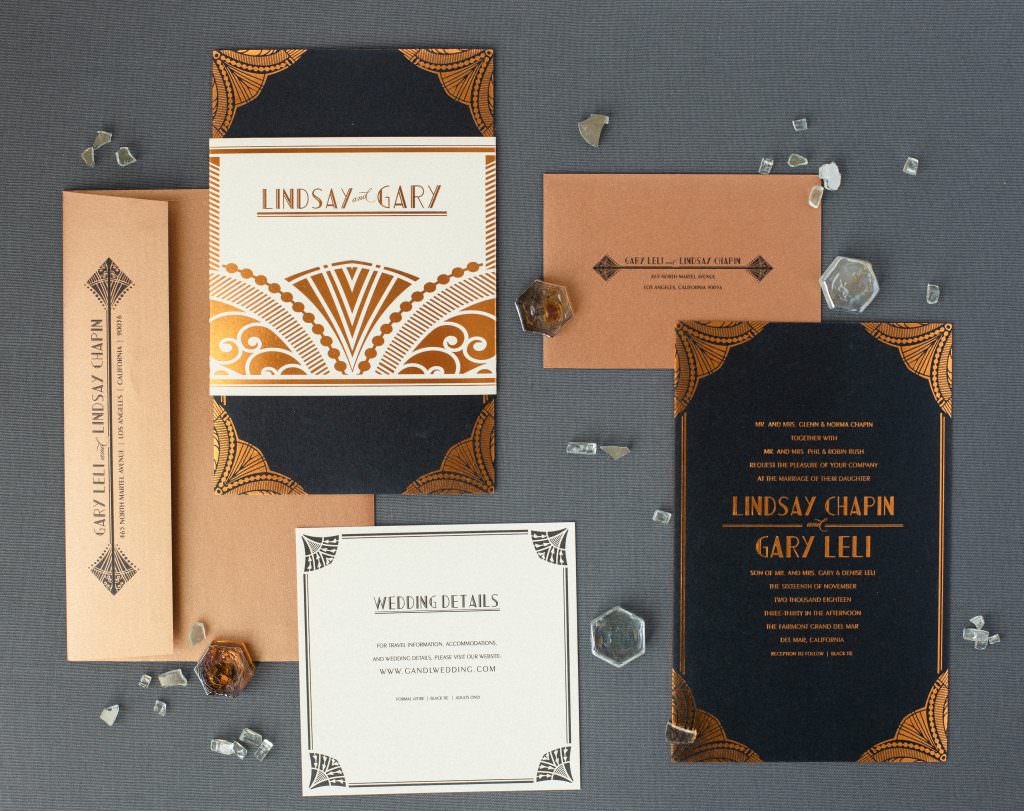 Sometimes your soulmate is closer than you think, and that couldn't ring more true for this classic love affair. While in New York for a work trip, Lindsay Chapin exchanged casual small talk with a co-worker at a company seminar, not realizing she'd be walking down the aisle to him nearly a few years later at a glamorous wedding in San Diego complete with all the vintage inspired details and Art Deco Wedding Invitations.