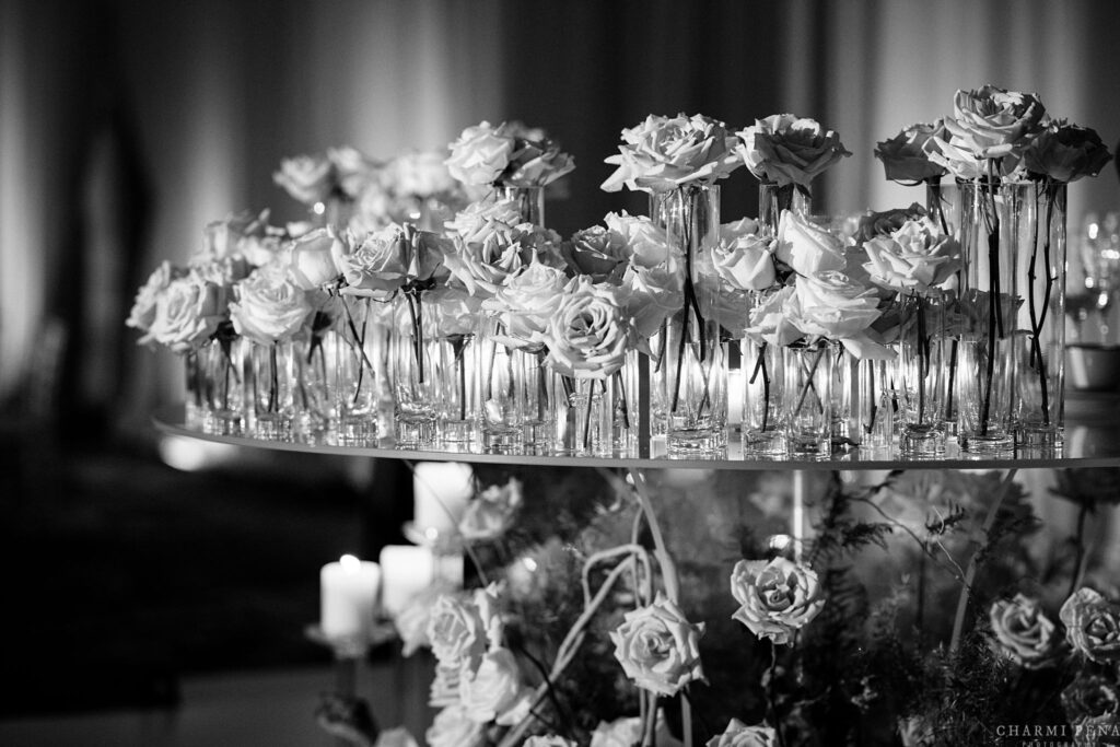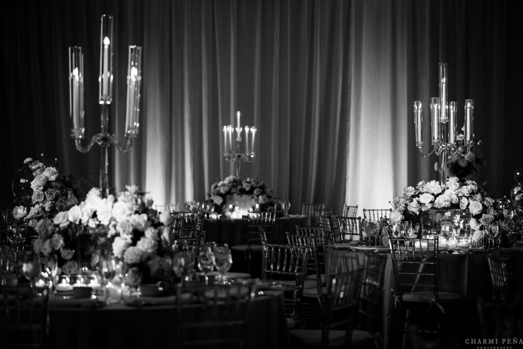 It was a combination. I mentioned the venue was very classic, the ballroom itself was spectacular. So what they did was, we had cocktail hours outdoors and indoors and then everybody came into the ballroom for the reception. We wanted a bit of a modern feeling even though the chandeliers had that rustic, elegant feel. Initially, we talked about draping the whole room in white, but we decided to do the back part so when guests walked in they still felt modern white summer feeling.