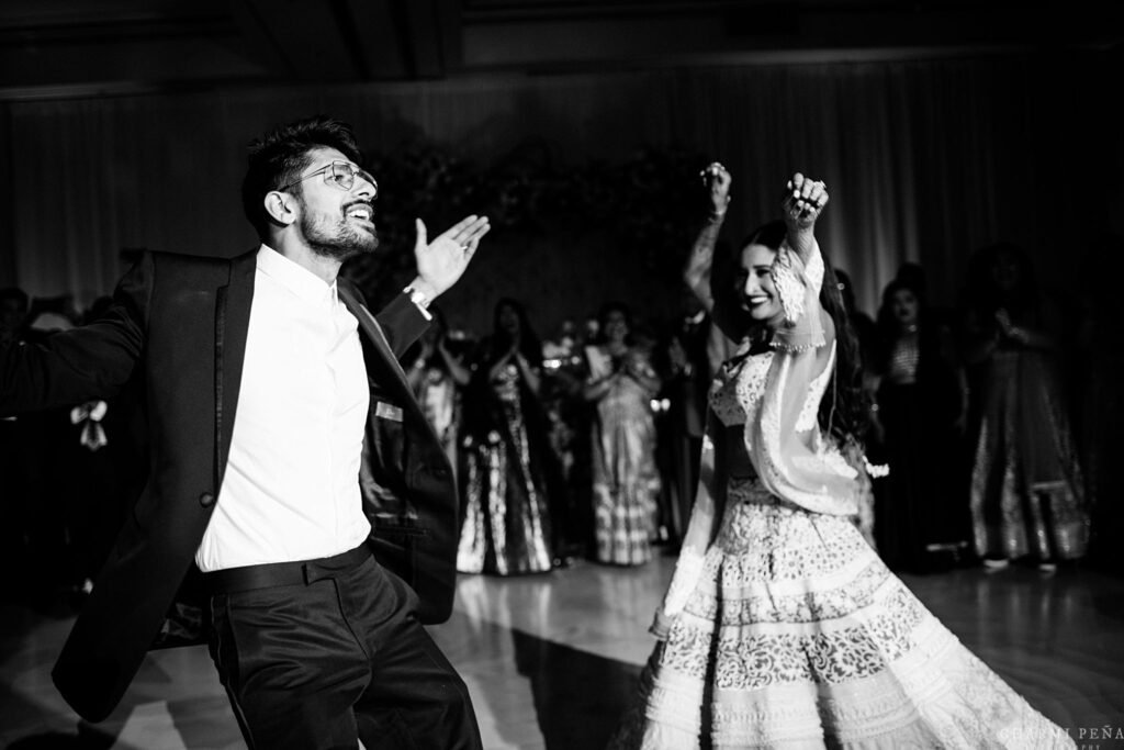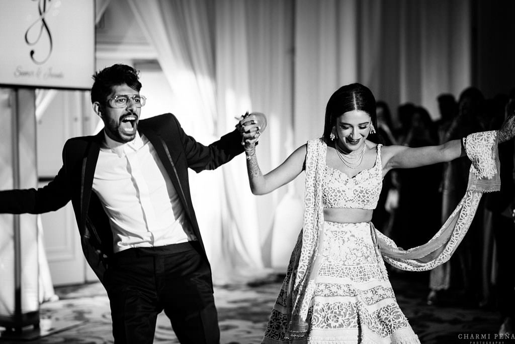 "Starting at the Sangeet, most brides will opt to wear a lehenga or a really long gown. Instead, Jaanki chose this below the knee gown that would allow her to bring in this flair with her really amazing shoes. You’ll just notice everything was very unique and brought together their flavors. If you take a look at the Sangeet photos, her outfit, her shoes, and even her hair was a different style that you don’t typically see brides wear. We did this cool design with these silver bobby pins, so when you look at it it’s just a very unique approach of bringing her look together. I’m not usually always a part of these conversations, but she brought me into them because she wanted to be sure that I was aligned in her vision.