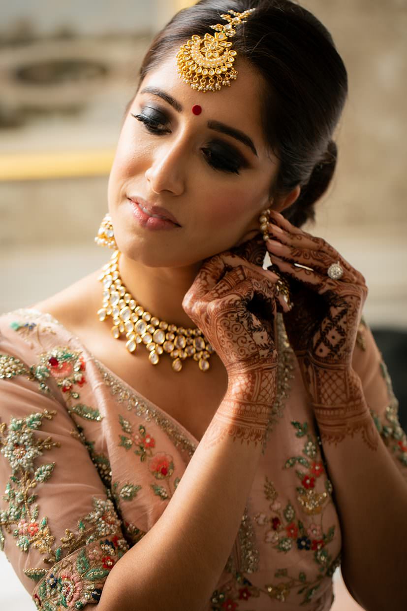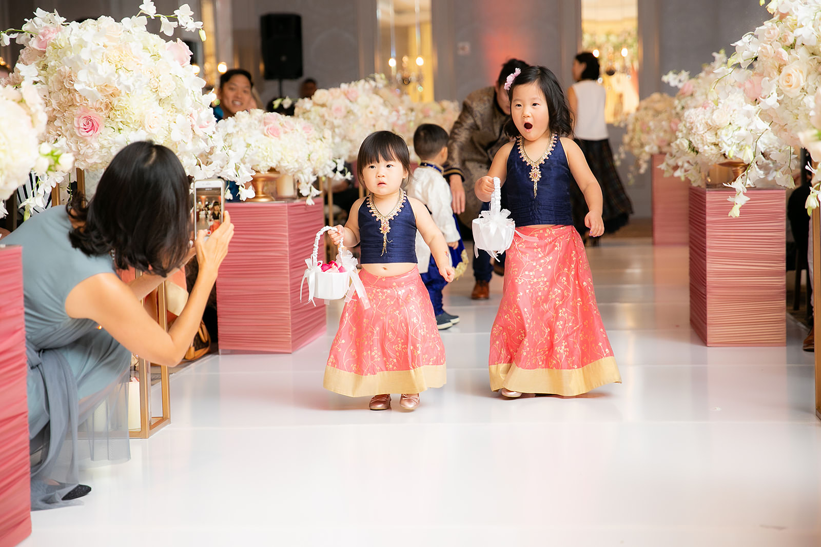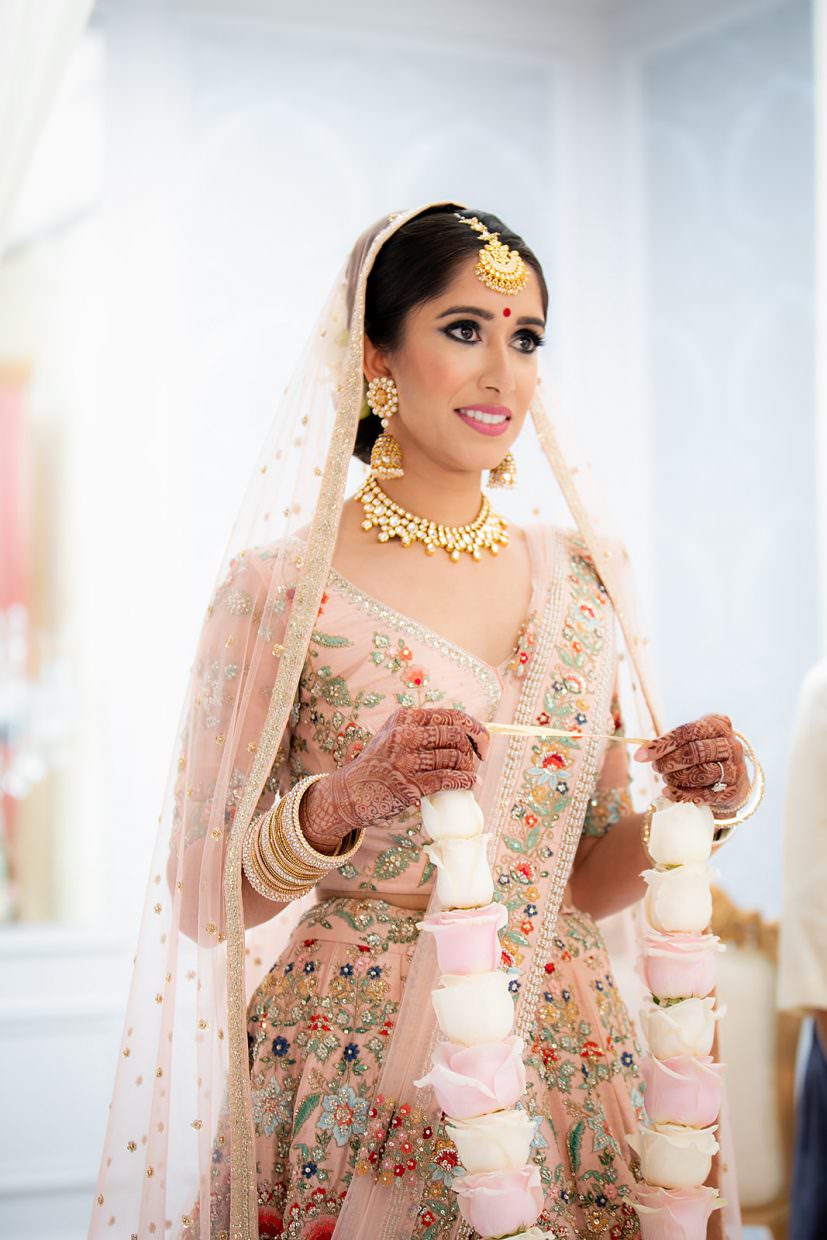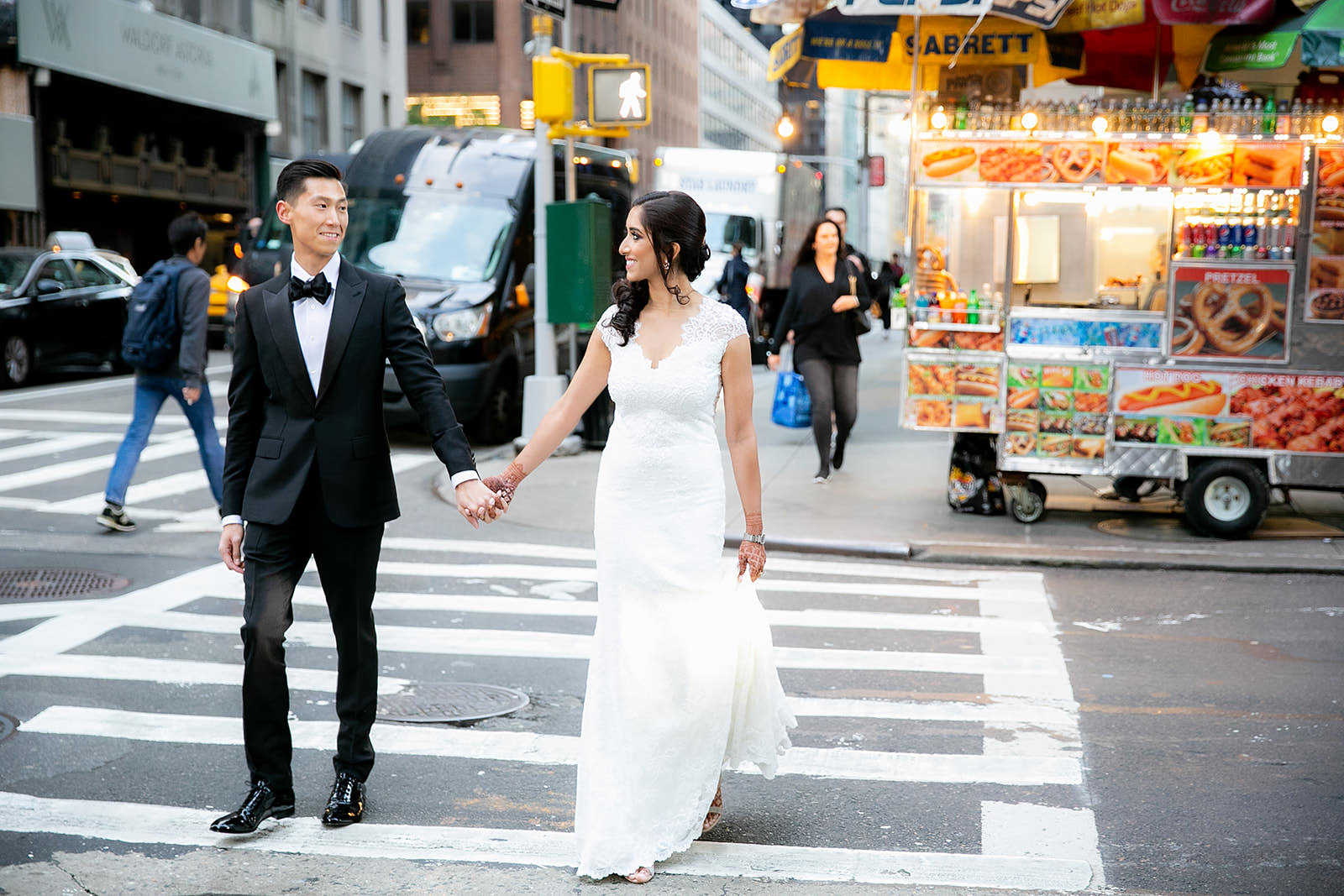 We wanted a metropolitan style wedding that equally blended two cultures and two religions. It was important for us that our guests experience both cultures that we come from, and since we both love NYC and our families were in the area, we thought it would be the right place. We chose pastel colors for our outfits and our bridal party outfits. My lehenga was a light pink while Jeff’s was off white with a light green scarf and turban. We had the bridesmaids match jeff with light green and gold saris, and the groomsmen matched my outfit with light pink scarves.
